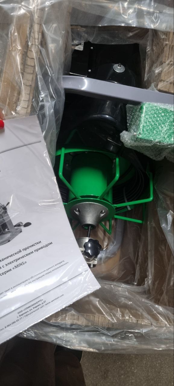 Произведена отгрузка электрической прочистной машины МИНС 8S-15N в г. Новосибирск с однофазным электроприводом мощностью 440 Вт для прочистки канализационных труб диаметром от 50 до 75 мм на длину до 15 м.